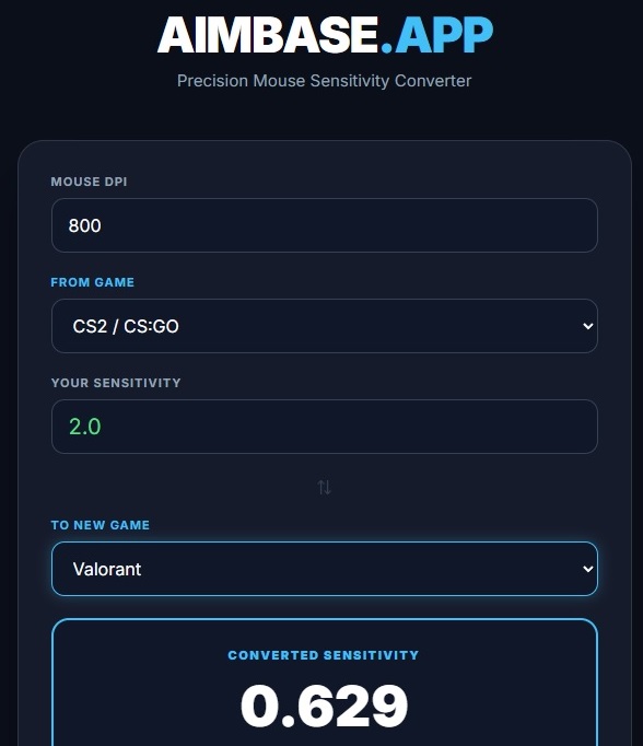 AimBase is a free, lightweight sensitivity converter. Easily sync your mouse sensitivity between The Finals, Valorant, and more! No more guessing, just perfect aim. 🎯